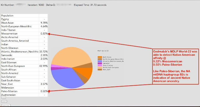 In another example, Genetic expert Dr. Doug McDonald told one of my relatives with 1% Native American and 0.78% East Asian that "0.003 of the E. Asia is borderline and MAY be actually Native American." Since Dr. McDonald's BGA analysis is thought to be excellent at detecting Native American ancestry, the seemingly trivial 0.003% amount still lends credence to your Native American DNA getting possibly assigned as something else especially if the SNPs tested at a location clusters with both Native American and East Asian populations (and more true if you tested at more than one reputable DNA company, and one shows NA but the other didn't or labelled it something else). Dr. McDonald says in an interview, "Native American is listed as just that. It is quite uncommon for it to be listed in error … except for genuine people from Siberia and Saami. FTDNA does not mistakenly show American as Asian. “Mayan” is the usual listing for any Native American north of Panama, through all of Mexico, and east of the Rockies in the USA and Canada." For more information on how the most popular personal genome companies assign DNA, please see 23andMe Aggregating and Assigning, FTDNA White Paper & Methodology and AncestryDNA White Paper.